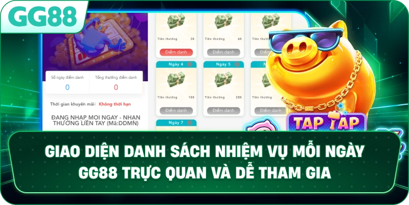 Giao diện danh sách nhiệm vụ mỗi ngày GG88 trực quan và dễ tham gia.